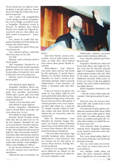 Peygamber Efendimiz Mirac’a teş- dervişlik hocalıktan üstün olmasaydı ancak sünnetini işleyenlere şefaat ede-