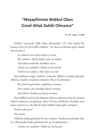 (Sohbet öncesinde Salih Baba divanından 129 nolu beyiti,”Bir