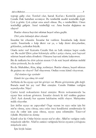 Bu da: Muhabbet, ihlas, âdap, teslimiyet. Bunlar olunca, beşerî sıfattan