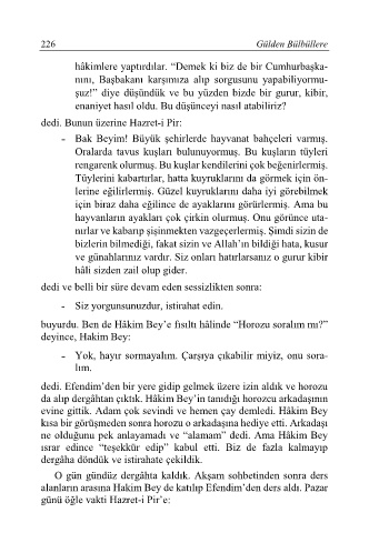 buyurdu. Ben de Hâkim Bey’e fısıltı hâlinde “Horozu soralım mı?”