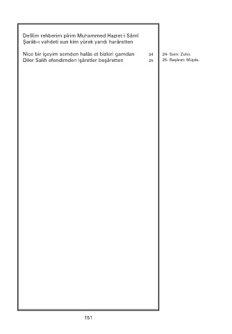 Delîlim rehberim pîrim Muhammed Hazret-i Sâmî Şarâb-ı vahdeti sun kim yürek yandı harâretten Nice bir içeyim semden halâs et bizleri gamdan 24 24- Sem: Zehir. Diler Salih efendimden işâretler beşâretten 25 25- Beşâret: Müjde. 151