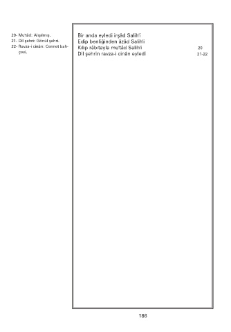 20- Mu'tâd: Alışılmış. Bir anda eyledi irşâd Salih'i 21- Dil şehri: Gönül şehri. Edip benliğinden âzâd Salih'i 22- Ravza-i cinân: Cennet bah- Kılıp râbıtayla mu'tâd Salih'i 20 çesi. Dil şehrin ravza-i cinân eyledi 21-22 186